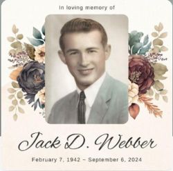 | Bio | Jackie Dean Webber, 82, of Oak Grove, Missouri, passed away on Friday, September 6, 2024 at Centerpoint Medical Center in Independence, MO. Funeral services will be held at 2:00 p.m. on Thursday, September 12th at First Baptist Church of Oak Grove; burial in Oak Grove Cemetery. The family will receive friends from 12:30 p.m. until service time at the church. In lieu of flowers, contributions may be made to First Baptist Church of Oak Grove. Jack was born February 7, 1942, in Smithville, MO, the son of William Ramsey and Mildred Irene (Hamm) McCarty. He was a Navy Veteran and retired from Armco Steel where he worked as a Millwright. Jack was also the Assistant Fire Chief for Sni Valley Fire Department for many years. He was a member of First Baptist Church of Oak Grove where he served as Deacon. Jack was an avid gardener, and enjoyed fishing, hunting, woodworking, working on old cars, and going to car shows. He played football in high school and still loved his sports, especially the Kansas City Chiefs and Royals. Jack was preceded in death by his parents; sister, Brenda Bettis; brother-in-law, David Bettis; and granddaughter, Jessica Webber. His survivors include his wife, Judy of the home; four children: Merrie Callahan of Blue Springs, MO, Laura Anderson (Tom) of Grain Valley, MO, Kevin Webber of Calhoun, MO, and Leah McCarty of Grain Valley; twelve grandchildren: Michael, Mellissa, Mikayla, McKensie, Molly, Ashlee, Dakota, Lyndsey, Joshua, Levi, Trace, and Hannah; ten great-grandchildren: Joshua, Strader, Isabella, Serenity, Justice, Andre, Rose, Maya Jane, Jackson, and Ezra; brother, Ed McCarty (Shirley) of Springfield, MO; and many nieces and nephews. Arrangements: Royer Funeral Home, Oak Grove, MO 816-690-4441 |